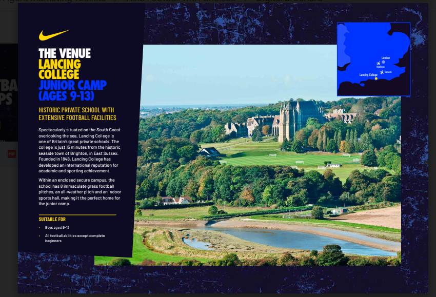 Campamento residencial de dos semanas para chicos y chicas de 9 a 17 años. Se realiza en Lancing College, escuela privada líder. Los jugadores serán entrenados por la Escuela Brighton & Hove Albion Soccer, en un programa intensivo de entrenamientos mientras mejoran o perfeccionan su habilidades en inglés con un equipo de profesores de profesores nativos. Junto con jugadores de más de 30 países, en una experiencia verdaderamente internacional.